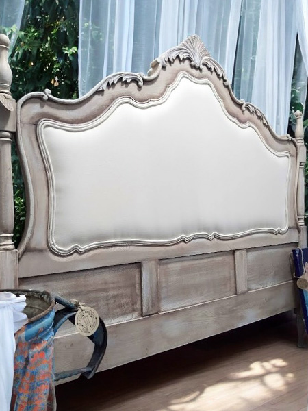 Cabecero de madera de castaño con tapizado en tono lino. Madera esmaltada con efecto envejecido en tonos tierra.